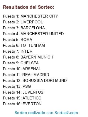 Lista de participantes: PSG, CHELSEA, JUVENTUS, ARSENAL, INTER, MANCHESTER UNITED, LIVERPOOL, BORUSSIA DORTMUND, BARCELONA, ROMA, MANCHESTER CITY, ATLÉTICO, TOTTENHAM, REAL MADRID, EVERTON, BAYERN MUNICH.