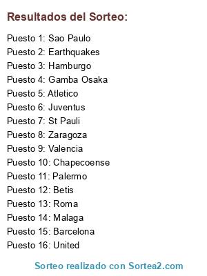 Lista de participantes: Earthquakes, Roma, Juventus, Chapecoense, United, Gamba Osaka, St Pauli, Betis, Sao Paulo, Barcelona, Palermo, Zaragoza, Valencia, Malaga, Atletico, Hamburgo.