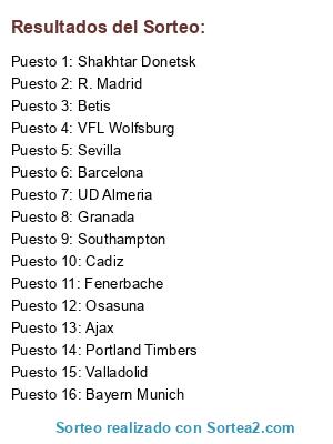 Lista de participantes: Valladolid, Cadiz, Betis, Bayern Munich, Ajax, Barcelona, Fenerbache, Granada, Osasuna, Portland Timbers, R. Madrid, Sevilla, Shakhtar Donetsk, Southampton, UD Almeria, VFL Wolfsburg.