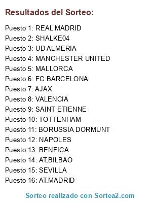 Lista de participantes: BENFICA, SHALKE04, REAL MADRID, UD ALMERIA, FC BARCELONA, SEVILLA, BORUSSIA DORMUNT, TOTTENHAM, AT,BILBAO, VALENCIA, AJAX, AT.MADRID, NAPOLES, MALLORCA, SAINT ETIENNE, MANCHESTER UNITED.