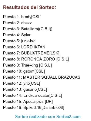 Lista de participantes: chazz, gusano[CSL], brody[CSL], junk-lsk, yito[CSL], Apocalipsis [DP], True-king [C.S.L], BUBUXTREME[LSK], Erickcardcator[C.S.L], RORONOA ZORO [C.S.L], Spike3:16[Disturbio08], LORD IKTAN, Sylar, MASTER SQUALL BRAZUCAS, gstom[CSL], Batalliom((C.B.I)).