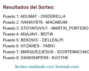 Lista de participantes: ANAJAVI - BEITIA, ADUMAT - CINDERELLA, MARQUEZJESUS - IGORTEMACHACO, IVANIN7878 - MACABU84, DANIISNIPER8 - KVOTHE, BEKOVIC - DELLEALPI, NYZANES - FABIO, STOYAYUVIC1 - MARTIN_PORTERO13.