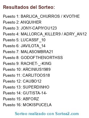 Lista de participantes: ABFORZ, MALASOMBRA21, CAUBO12, GODOFTHENORTHSS, JAVILOTA_14, LUCASSF_10, MALLORCA_KILLER9 / ADRY_AN12, MOKISPUCELA, RACHET-_-KING, GUTISTA-14-, CARLITOOS18, ANQUIHER, BARLICA_CHURROS / KVOTHE, SUPERDINHO, ARCINIUS1989, JONY-CAPIYOU123.