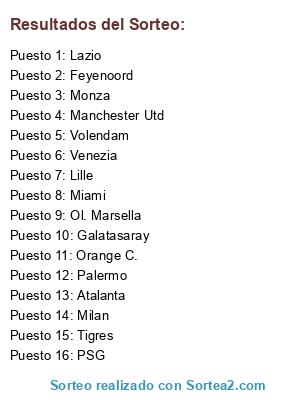 Lista de participantes: Lazio, Monza, Orange C., Atalanta, Volendam, Miami, Lille, Milan, Ol. Marsella, Tigres, Palermo, Feyenoord, Venezia, Galatasaray, Manchester Utd, PSG.