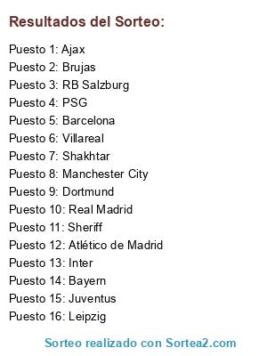 Lista de participantes: Barcelona, Manchester City, Atlético de Madrid, PSG, Juventus, Ajax, Villareal, RB Salzburg, Dortmund, Real Madrid, Inter, Bayern, Shakhtar, Leipzig, Sheriff, Brujas.