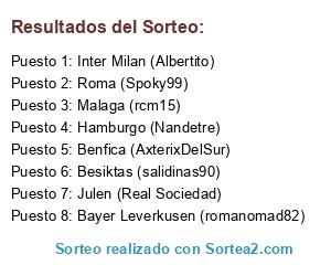Lista de participantes: Hamburgo (Nandetre), Julen (Real Sociedad), Besiktas (salidinas90), Benfica (AxterixDelSur), Inter Milan (Albertito), Malaga (rcm15), Bayer Leverkusen (romanomad82), Roma (Spoky99).