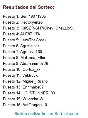 Lista de participantes: Abrahamm0726, Hectoryenzo, Cortex_xx, JC_STUNNER_90, Sem19071986, ALE87_ITA, W-jorcha-W, Agresivo100, Enrimabe07, Mallorca_killer, AntGragera10, Agustainer, Miguel_Ruano, KaiSER-SH7/Chev_CheLLioS_, LazaTheGreek, Veldruuk.