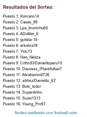 Lista de participantes: Superdinho, Lps_bruninhu66, Komario14, ADuMat_6, abforz/Danielito_87, Young_Pro97, Crthn93/Danielitoperu10, Boki_todor, Davosss_/Plantifulbat7, Cases_89, Sussi1313, Abrahamm0726, gutista-14-, erkobra18, Yiou13, Neo_Nekza.