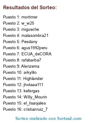 Lista de participantes: agus1992peru, Alenzema, arkylito, Highlander, kefergas, cristianruiz_7, Pesdany, ECUA_deCORA, Willy_Mourin, el_lisaojales, jhotaaa111, malasombra21, migueche, mortimer, rafabarba7, w_w25.