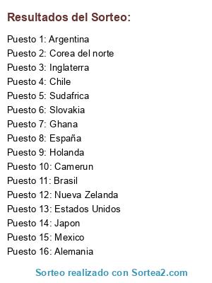 Lista de participantes: Nueva Zelanda, España, Slovakia, Estados Unidos, Alemania, Corea del norte, Argentina, Camerun, Sudafrica, Japon, Mexico, Brasil, Inglaterra, Chile, Ghana, Holanda.