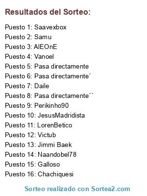 Lista de participantes: Daile, LorenBetico, JesusMadridista, Jimmi Baek, Saavexbox, Naandobel78, Victub, Chachiquesi, Galloso, Samu, AlEOnE, Vanoel, Perikinho90, Pasa directamente, Pasa directamente´, Pasa directamente´´.