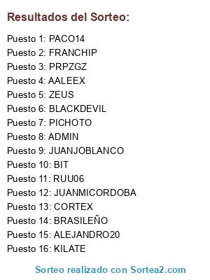 Lista de participantes: ZEUS, JUANMICORDOBA, PRPZGZ, KILATE, AALEEX, PICHOTO, CORTEX, FRANCHIP, BIT, ADMIN, ALEJANDRO20, RUU06, BRASILEÑO, PACO14, BLACKDEVIL, JUANJOBLANCO.