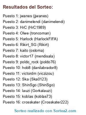 Lista de participantes: victor17 (mendisala), victordm (viczizou), Rikirt_SG (Rikirt), danimelendi (danimelendi), kaito (osloma), HrC (HrC1989), Olwe (troncoman), hob8 (danilabrador8), Ska (Ska0123), Harlock (HarlockFIFA), crosskater (Crosskater222), poldo_rock (poldo76), jwanes (jjwanes), ShinSgo (ShinSgo), koblas (koblas73), lauzi (Gorkalauzi).
