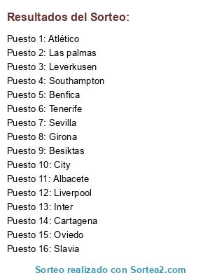 Lista de participantes: Tenerife, Southampton, Inter, City, Cartagena, Las palmas, Leverkusen, Benfica, Slavia, Liverpool, Besiktas, Girona, Sevilla, Atlético, Oviedo, Albacete.