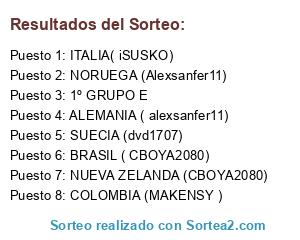 Lista de participantes: BRASIL ( CBOYA2080), NUEVA ZELANDA (CBOYA2080), COLOMBIA (MAKENSY ), ITALIA( iSUSKO), 1º GRUPO E, NORUEGA (Alexsanfer11), ALEMANIA ( alexsanfer11), SUECIA (dvd1707).
