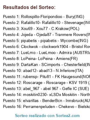 Lista de participantes: Jojeda - Ojeda87 - Tranmere Rovers(ING), Xou69 - Xou77 - C.Krakow(POL), Rollospillo-Floripondioo - Bury(ING), elvarillas - BenderBcn - Innsbruck(AUSTRIA), LoPeina- LoPeina - Amiens(FR), Rafalillo10- Rafalillo10 - Stevenage(ING), Perramenpeluden - Chekevo - Bielsko Biala(POL), Clockwok - clockwork1904 - Bristol Rovers(ING), abad12- abad13 - N.Inferiore(ITA), abel_967 - abel 967 - Gefle IC (SUE), rubensp- Pitu81 - FK Haugesund(NOR), LueLmo - LueLmoo - Admira (AUSTRIA), pipabetis - pipabetis - Wycombe(ING), Roscarage - Roscarage - KSV 1919 (AUSTRIA), DartaKan - SCimports - Chesterfield(ING), moskitin0230- xLSDx Moskitin - Northampton(ING).