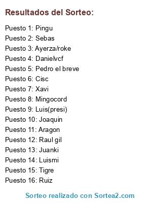 Lista de participantes: Mingocord, Raul gil, Joaquin, Juanki, Luis(presi), Xavi, Cisc, Tigre, Danielvcf, Sebas, Luismi, Ruiz, Aragon, Pingu, Pedro el breve, Ayerza/roke.