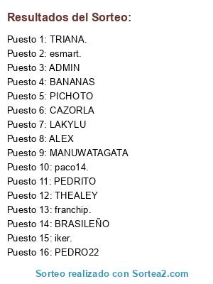 Lista de participantes: iker., franchip., paco14., esmart., PEDRITO, CAZORLA, ALEX, MANUWATAGATA, ADMIN, PEDRO22, BANANAS, PICHOTO, BRASILEÑO, THEALEY, LAKYLU, TRIANA..