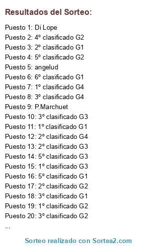 Lista de participantes: 1º clasificado G1, 1º clasificado G2, 1º clasificado G3, 1º clasificado G4, 2º clasificado G1, 2º clasificado G2, 2º clasificado G3, Atilicah, angelud, P.Marchuet, Di Lope, 3º clasificado G1, 3º clasificado G2, 3º clasificado G3, 2º clasificado G4, 3º clasificado G4, 4º clasificado G1, 4º clasificado G2, 4º clasificado G3, 5º clasificado G1, 5º clasificado G2, 5º clasificado G3, 6º clasificado G1, 6º clasificado G2.