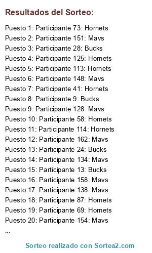 Lista de participantes: Participante 1: Bucks, Participante 2: Bucks, Participante 3: Bucks, Participante 4: Bucks, Participante 5: Bucks, Participante 6: Bucks, Participante 7: Bucks, Participante 8: Bucks, Participante 9: Bucks, Participante 10: Bucks, Participante 11: Bucks, Participante 12: Bucks, Participante 13: Bucks, Participante 14: Bucks, Participante 15: Bucks, Participante 16: Bucks, Participante 17: Bucks, Participante 18: Bucks, Participante 19: Bucks, Participante 20: Bucks, Participante 21: Bucks, Participante 22: Bucks, Participante 23: Bucks, Participante 24: Bucks, Participante 25: Bucks, Participante 26: Bucks, Participante 27: Bucks, Participante 28: Bucks, Participante 29: Bucks, Participante 30: Bucks, Participante 31: Bucks, Participante 32: Bucks, Participante 33: Bucks, Participante 34: Bucks, Participante 35: Bucks, Participante 36: Bucks, Participante 37: Bucks, Participante 38: Bucks, Participante 39: Hornets, Participante 40: Hornets, Participante 41: Hornets, Participante 42: Hornets, Participante 43: Hornets, Participante 44: Hornets, Participante 45: Hornets, Participante 46: Hornets, Participante 47: Hornets, Participante 48: Hornets, Participante 49: Hornets, Participante 50: Hornets, Participante 51: Hornets, Participante 52: Hornets, Participante 53: Hornets, Participante 54: Hornets, Participante 55: Hornets, Participante 56: Hornets, Participante 57: Hornets, Participante 58: Hornets, Participante 59: Hornets, Participante 60: Hornets, Participante 61: Hornets, Participante 62: Hornets, Participante 63: Hornets, Participante 64: Hornets, Participante 65: Hornets, Participante 66: Hornets, Participante 67: Hornets, Participante 68: Hornets, Participante 69: Hornets, Participante 70: Hornets, Participante 71: Hornets, Participante 72: Hornets, Participante 73: Hornets, Participante 74: Hornets, Participante 75: Hornets, Participante 76: Hornets, Participante 77: Hornets, Participante 78: Hornets, Participante 79: Hornets, Participante 80: Hornets, Participante 81: Hornets, Participante 82: Hornets, Participante 83: Hornets, Participante 84: Hornets, Participante 85: Hornets, Participante 86: Hornets, Participante 87: Hornets, Participante 88: Hornets, Participante 89: Hornets, Participante 90: Hornets, Participante 91: Hornets, Participante 92: Hornets, Participante 93: Hornets, Participante 94: Hornets, Participante 95: Hornets, Participante 96: Hornets, Participante 97: Hornets, Participante 98: Hornets, Participante 99: Hornets, Participante 100: Hornets, Participante 101: Hornets, Participante 102: Hornets, Participante 103: Hornets, Participante 104: Hornets, Participante 105: Hornets, Participante 106: Hornets, Participante 107: Hornets, Participante 108: Hornets, Participante 109: Hornets, Participante 110: Hornets, Participante 111: Hornets, Participante 112: Hornets, Participante 113: Hornets, Participante 114: Hornets, Participante 115: Hornets, Participante 116: Hornets, Participante 117: Hornets, Participante 118: Hornets, Participante 119: Hornets, Participante 120: Hornets, Participante 121: Hornets, Participante 122: Hornets, Participante 123: Hornets, Participante 124: Hornets, Participante 125: Hornets, Participante 126: Hornets, Participante 127: Hornets, Participante 128: Mavs, Participante 129: Mavs, Participante 130: Mavs, Participante 131: Mavs, Participante 132: Mavs, Participante 133: Mavs, Participante 134: Mavs, Participante 135: Mavs, Participante 136: Mavs, Participante 137: Mavs, Participante 138: Mavs, Participante 139: Mavs, Participante 140: Mavs, Participante 141: Mavs, Participante 142: Mavs, Participante 143: Mavs, Participante 144: Mavs, Participante 145: Mavs, Participante 146: Mavs, Participante 147: Mavs, Participante 148: Mavs, Participante 149: Mavs, Participante 150: Mavs, Participante 151: Mavs, Participante 152: Mavs, Participante 153: Mavs, Participante 154: Mavs, Participante 155: Mavs, Participante 156: Mavs, Participante 157: Mavs, Participante 158: Mavs, Participante 159: Mavs, Participante 160: Mavs, Participante 161: Mavs, Participante 162: Mavs, Participante 163: Mavs, Participante 164: Mavs, Participante 165: Mavs.