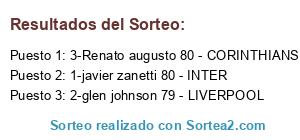 Lista de participantes: 1-javier zanetti 80 - INTER, 2-glen johnson 79 - LIVERPOOL, 3-Renato augusto 80 - CORINTHIANS.