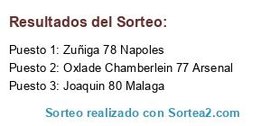 Lista de participantes: Joaquin 80 Malaga, Oxlade Chamberlein 77 Arsenal, Zuñiga 78 Napoles.