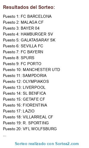 Lista de participantes: SL BENFICA, FC BAYERN, GALATASARAY SK, R. SPORTING, OLYMPIAKOS, SPURS, AT. OSASUNA, FIORENTINA, FC BARCELONA, VALENCIA CF, HAMBURGER SV, MALAGA CF, FC PORTO, LAZIO, GETAFE CF, REAL MADRID CF, NEWCASTLE UTD, PSV, SAMPDORIA, MANCHESTER CITY, MANCHESTER UTD, SEVILLA FC, VILLARREAL CF, BAYER 04, PANATHINAIKOS, LIVERPOOL, VFL WOLFSBURG.