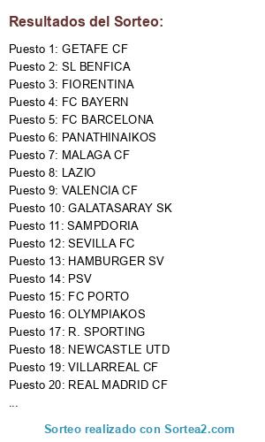 Lista de participantes: SL BENFICA, FC BAYERN, GALATASARAY SK, R. SPORTING, OLYMPIAKOS, SPURS, AT. OSASUNA, FIORENTINA, FC BARCELONA, VALENCIA CF, HAMBURGER SV, MALAGA CF, FC PORTO, LAZIO, GETAFE CF, REAL MADRID CF, NEWCASTLE UTD, PSV, SAMPDORIA, MANCHESTER CITY, MANCHESTER UTD, SEVILLA FC, VILLARREAL CF, BAYER 04, PANATHINAIKOS, LIVERPOOL.