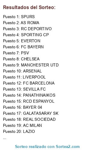 Lista de participantes: LIVERPOOL, FC BAYERN, SLF BENFICA, REAL MADRID CF, GALATASARAY SK, VFL WOLFSBURG, MANCHESTER UTD, FC BARCELONA, RC DEPORTIVO, AC MILAN, AJAX, ARSENAL, GETAFE CF, MALAGA CF, RCD ESPANYOL, LAZIO, AT. OSASUNA, MANCHESTER CITY , CHELSEA, INTER, OLYMPIAKOS, UDINESE, BOR. DORTMUND, BAYER 04, EVERTON, SEVILLA FC, SPORTING CP, SAMPDORIA, AS ROMA, PSV, REAL SOCIEDAD, SUNDERLAND, HAMBURGER SV, FC PORTO, PANATHINAIKOS, SPURS.