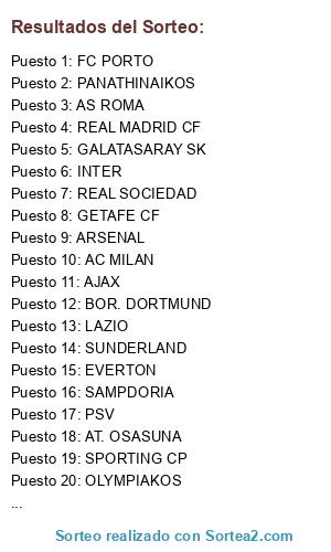 Lista de participantes: LIVERPOOL, FC BAYERN, SLF BENFICA, REAL MADRID CF, GALATASARAY SK, VFL WOLFSBURG, MANCHESTER UTD, FC BARCELONA, RC DEPORTIVO, AC MILAN, AJAX, ARSENAL, GETAFE CF, MALAGA CF, RCD ESPANYOL, LAZIO, AT. OSASUNA, MANCHESTER CITY , CHELSEA, INTER, OLYMPIAKOS, UDINESE, BOR. DORTMUND, BAYER 04, EVERTON, SEVILLA FC, SPORTING CP, SAMPDORIA, AS ROMA, PSV, REAL SOCIEDAD, SUNDERLAND, HAMBURGER SV, FC PORTO, PANATHINAIKOS, SPURS.