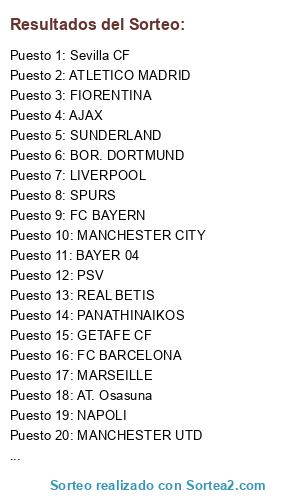 Lista de participantes: FC BAYERN, FC BARCELONA, SL BENFICA, SPORTING CP, NAPOLI, GALATASARAY SK, Leed united, BOR. DORTMUND, AT. Osasuna , MALAGA CF, VALENCIA, SUNDERLAND , BAYER 04, REAL BETIS, LIVERPOOL, AJAX, OLYMPIAKOS , ATLETICO MADRID, GETAFE CF, SPURS, Sevilla CF, MANCHESTER CITY, FIORENTINA, SAMPDORIA, HAMBURGER SV, AS ROMA, ARSENAL, VILLARREAL CF, MARSEILLE, PANATHINAIKOS, BOCA JUNIORS, MANCHESTER UTD, PSV.