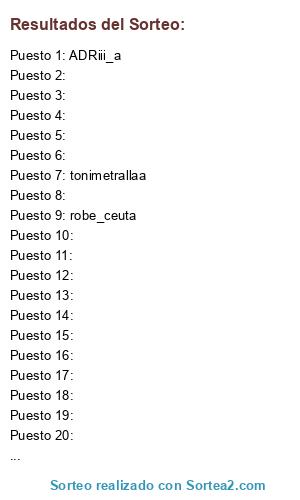 Lista de participantes: danielus12, tonimetrallaa, ADRiii_a, robe_ceuta, , , , , , , , , , , , , , , , , , , , , , , , , , , , .