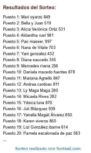 Lista de participantes: Florencia Daniela 673, Claudia jeldres 406, Mercedes rivera 256, Aldanitha rust 981, Yanella Magali Álvarez 850, Noelia Molina 350, Luciana cattaneo 340, Pamme Paccetti 493, Lizi González ibarne 614, Cindy fuentealba 581, Mariana Agnello 847, Bella y Juan 519, Romiina López 039, Mari oyarzo 849, Flor Iglesias 958, Stefi Ramos 439, Yanina Agnello 475, Karen viveros 865, Diana saucedo 355, Gonzalo ferrua 992, Juli Blázquez 939, Cintia jaz 024, Roo mii 585, Alicia Verónica Ortiz 531, Yani gonzalez 432, Andrea cardoso 811, Micaela Rives 282, Patricia García 940, Pamela escalonada de paz 583, Silvia Montenegro 383, Jimena villafañe 297, Ly Maga Maga 280, Rocío y Jaime 643, Tatiana Batista 881, Pao masser. 997, Angélica lencina 861, Daniela macedo fuentes 878, Nana de Vitale 703, Yésica luna 870, Nadia Herrera 683.