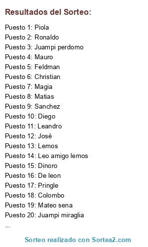 Lista de participantes: Kare, Christian, Rochi, Diego, Matias, Leandro, Pringle, Mauro, José, Ronaldo, Senita, Dinoro, Piola, Mateo sena, De leon, Corbo, Juampi perdomo, Lemos, Magia, Feldman, Juampi miraglia, Sanchez, Colombo, Leo amigo lemos.