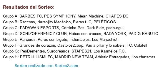 Lista de participantes: Parceros, PETRULUISMI FC, Mean Machine, Naranjito Mecánico, MADRID NEW TEAM, Los chatarras, CHAPES DC, Athletic Entregados, Puros con bigote, PesDementes, PAD-G-KANUTO, Raccons, Los Karmelos F.C., STAPES21, BARBES FC, PES SYMPHONY, Indomables, PADAWAN ESPORTS, Cordoba Pes, Los Mariachis!!, Dark Side, padburgui, PELÉTICOS, FC. Calafell, BADA YORK, SCHIZOPHRENICZ CLUB, Surcoreanos, Grandes de corazon, Castolos2coop, Habas con chocos, Vas a pillar y lo sabéis, Fieras f. C.