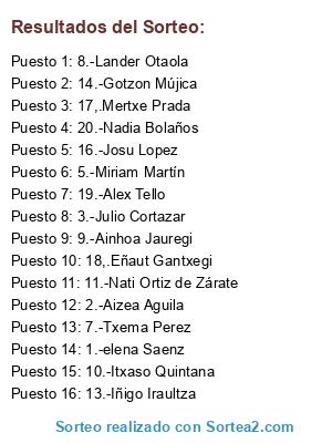 Lista de participantes: 1.-elena Saenz, 2.-Aizea Aguila, 3.-Julio Cortazar, 4.-Francisca Vazquez, 5.-Miriam Martín, 6.-Eneko Sagardoi, 7.-Txema Perez, 8.-Lander Otaola, 9.-Ainhoa Jauregi, 10.-Itxaso Quintana, 11.-Nati Ortiz de Zárate, 12.-Marina Aparicio, 13.-Iñigo Iraultza, 14.-Gotzon Mújica, 15.-Ane Gisasola, 16.-Josu Lopez, 17,.Mertxe Prada, 18,.Eñaut Gantxegi, 19.-Alex Tello, 20.-Nadia Bolaños, .