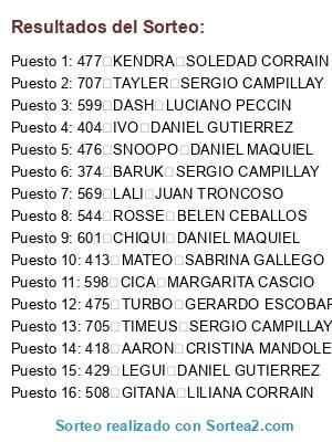 Lista de participantes: 475 TURBO GERARDO ESCOBAR, 508 GITANA LILIANA CORRAIN, 601 CHIQUI DANIEL MAQUIEL, 476 SNOOPO DANIEL MAQUIEL, 477 KENDRA SOLEDAD CORRAIN, 544 ROSSE BELEN CEBALLOS, 569 LALI JUAN TRONCOSO, 374 BARUK SERGIO CAMPILLAY, 404 IVO DANIEL GUTIERREZ, 418 AARON CRISTINA MANDOLESI, 705 TIMEUS SERGIO CAMPILLAY, 707 TAYLER SERGIO CAMPILLAY, 599 DASH LUCIANO PECCIN, 598 CICA MARGARITA CASCIO, 413 MATEO SABRINA GALLEGO, 429 LEGUI DANIEL GUTIERREZ.