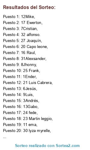 Lista de participantes: 1Ender,, 2Luciano,, 3Andrés,, 4Mario,, 5Ronnie,, 6Jesús,, 7Cristian,, 8Jhonny,, 9Luis,, 10 Juan Carlos,, 11 ema,, 12Mike,, 13Gabo,, 14sebas,, 15 Nacho,, 16 Raul,, 17 Ewerton,, 18 Sergy,, 19 Pablo,, 20 Capo leone,, 21 Luis Cabrera,, 22Adrian,, 23 Martin leggio,, 24 fede,, 25 Frank,, 26 leo,, 27 Joaquín,, 28 Carlos,, 29 Mariano,, 30 lyza myrelle,, 31Alexsander,, 32 alfonso..