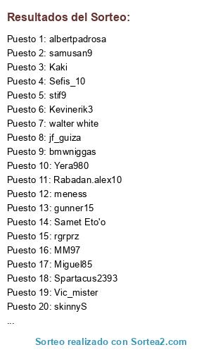 Lista de participantes: Ivairu, albertpadrosa, albgalsan, alexpitarque, beko_vic, gunner15, bmwniggas, carlosnavalon, FOXes10z, Spartacus2393, meness, j971385507, contreras, Lacalle90, Kaki, Kevinerik3, manolonti89, MM97, donCola, bol_bol5, Pachet, Samet Eto'o, Samugalego, samusan9, skinnyS, stif9, Yera980, Leobarcelona, Santyso, Vic_mister, walter white, jf_guiza, Miguel85, rgrprz, Sefis_10, Javiilote5, juankyraba, Rabadan.alex10, noel_moreno, Povedilla.