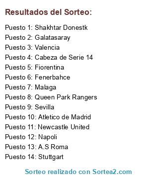 Lista de participantes: Atletico de Madrid, Sevilla, Valencia, Galatasaray, Fenerbahce, Malaga, Fiorentina, Napoli, Queen Park Rangers, Stuttgart, A.S Roma, Newcastle United, Shakhtar Donestk, Cabeza de Serie 14.