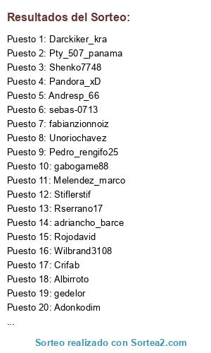 Lista de participantes: sayin_27, Rserrano17, adriancho_barce, Mauropi1, Shenko7748, Juanca9313, juanka1907, Decano, sebas-0713, Javle27, Pty_507_panama, Stiflerstif, Melendez_marco, Andresp_66, Vasco1208, Sebasp_0311, Pedro_rengifo25, Adonkodim, gedelor, Crifab, gabogame88, Unoriochavez, fabianzionnoiz, Wilbrand3108, Pandora_xD, Andree03daza, Darckiker_kra, Marcianoeskrlata, El buen once, Rojodavid, Albirroto, Davalty, Achiras, Riskbreak12.