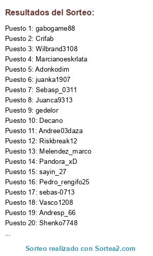 Lista de participantes: sayin_27, Rserrano17, adriancho_barce, Mauropi1, Shenko7748, Juanca9313, juanka1907, Decano, sebas-0713, Javle27, Pty_507_panama, Stiflerstif, Melendez_marco, Andresp_66, Vasco1208, Sebasp_0311, Pedro_rengifo25, Adonkodim, gedelor, Crifab, gabogame88, Unoriochavez, fabianzionnoiz, Wilbrand3108, Pandora_xD, Andree03daza, Darckiker_kra, Marcianoeskrlata, El buen once, Rojodavid, Albirroto, Davalty, Achiras, Riskbreak12.