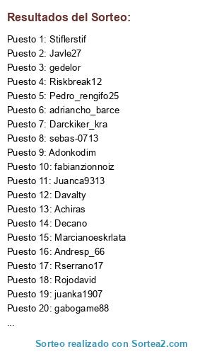 Lista de participantes: sayin_27, Rserrano17, adriancho_barce, Mauropi1, Shenko7748, Juanca9313, juanka1907, Decano, sebas-0713, Javle27, Pty_507_panama, Stiflerstif, Melendez_marco, Andresp_66, Vasco1208, Sebasp_0311, Pedro_rengifo25, Adonkodim, gedelor, Crifab, gabogame88, Unoriochavez, fabianzionnoiz, Wilbrand3108, Pandora_xD, Andree03daza, Darckiker_kra, Marcianoeskrlata, El buen once, Rojodavid, Albirroto, Davalty, Achiras, Riskbreak12.