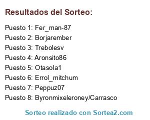 Lista de participantes: Errol_mitchum, Byronmixeleroney/Carrasco, Trebolesv, Peppuz07, Aronsito86, Borjarember, Otasola1, Fer_man-87.