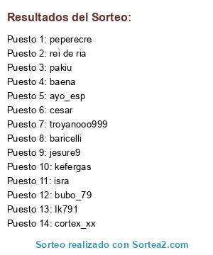 Lista de participantes: kefergas, peperecre, jesure9, rei de ria, bubo_79, baena, cortex_xx, troyanooo999, isra, baricelli, pakiu, ayo_esp, Ik791, cesar.