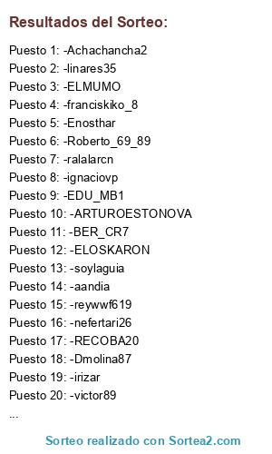 Lista de participantes: -lagmor80, -INSKI77, -linares35, -EDU_MB1, -irizar, -ralalarcn, -ignaciovp, -Enosthar, -aandia, -NENECR7, -nefertari26, -EHB_KIKE, -RECOBA20, -soylaguia, -ELMUMO, -ELOSKARON, -GURRIPULLI, -MOGITAS, -ZER11, -ARTUROESTONOVA, -reywwf619, -franciskiko_8, -BER_CR7, -GOKUH27, -Roberto_69_89, -Achachancha2, -calcetines, -Dmolina87, -victor89, -MARIO_LR.