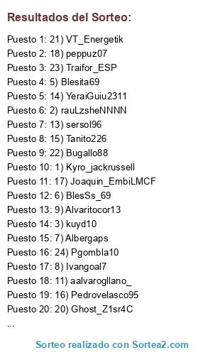 Lista de participantes: 1) Kyro_jackrussell, 2) rauLzsheNNNN, 3) kuyd10, 4) VT_D1aMant1K, 5) Blesita69, 6) BlesSs_69, 7) Albergaps, 8) Ivangoal7, 9) Alvaritocor13, 10) IvaanM95, 11) aalvarogllano_, 12) Palomotitular, 13) sersol96, 14) YeraiGuiu2311, 15) Tanito226, 16) Pedrovelasco95, 17) Joaquin_EmbiLMCF, 18) peppuz07, 19) juandc1996, 20) Ghost_Z1sr4C, 21) VT_Energetik, 22) Bugallo88, 23) Traifor_ESP, 24) Pgombla10, 25) dmunoz01.