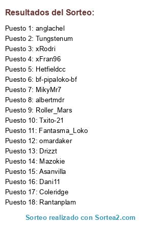 Lista de participantes: Roller_Mars, MikyMr7, mazokie, Hetfieldcc, Coleridge, Drizzt, Fantasma_Loko, Tungsteno, Txito21, Rantanplam21, Albertmdr, Asanvillauskas, Omardaker, dani11, bf-pipaloko-bf, anglachel, xRodri_, xFran96, Collangello, djjony.