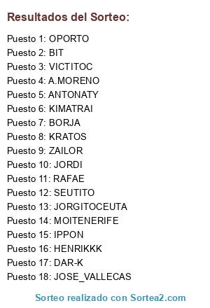 Lista de participantes: SEUTITO, JORGITOCEUTA, RAFAE, KIMATRAI, ZAILOR, BIT, HENRIKKK, BORJA, DAR-K, ANTONATY, OPORTO, JOSE_VALLECAS, IPPON, JORDI, VICTITOC, KRATOS, A.MORENO, MOITENERIFE.