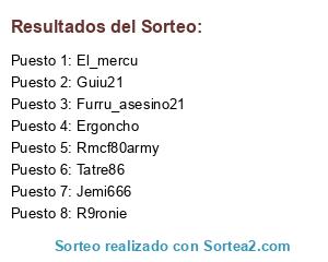 Lista de participantes: Rmcf80army, Furru_asesino21, El_mercu, R9ronie, Tatre86, Ergoncho, Guiu21, Jemi666.
